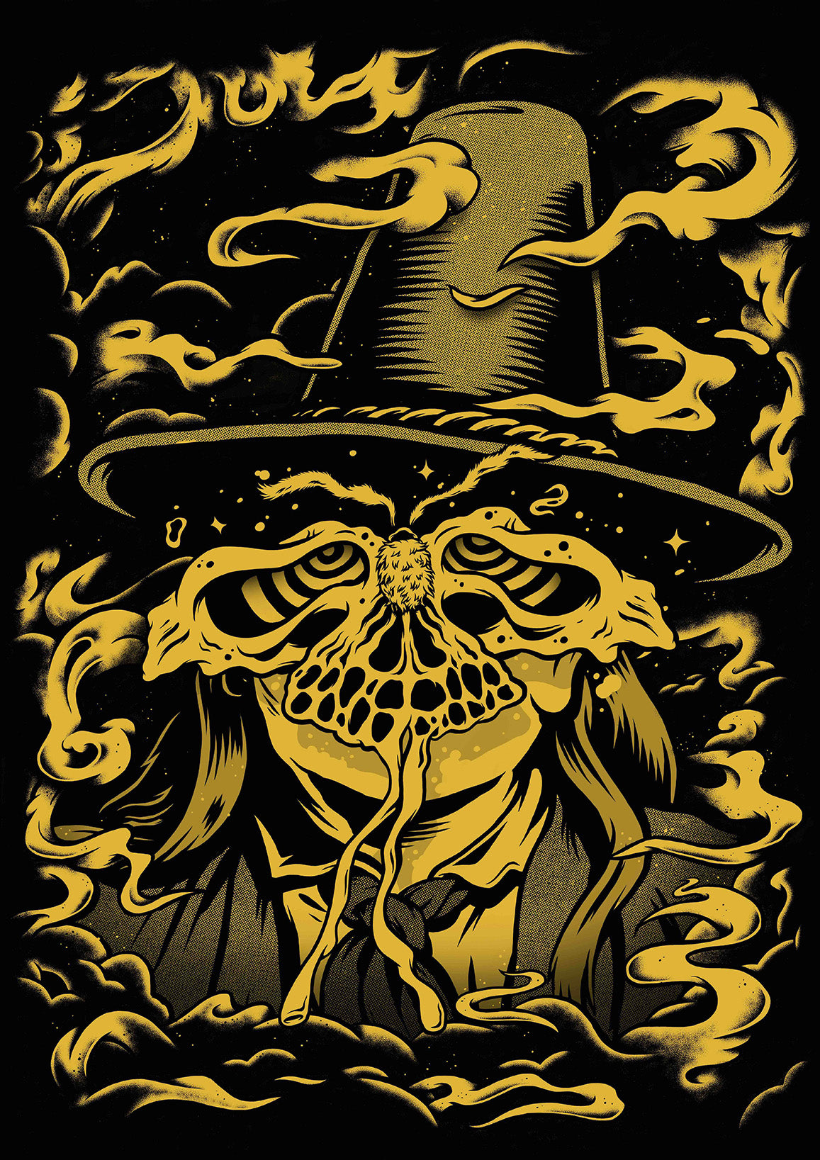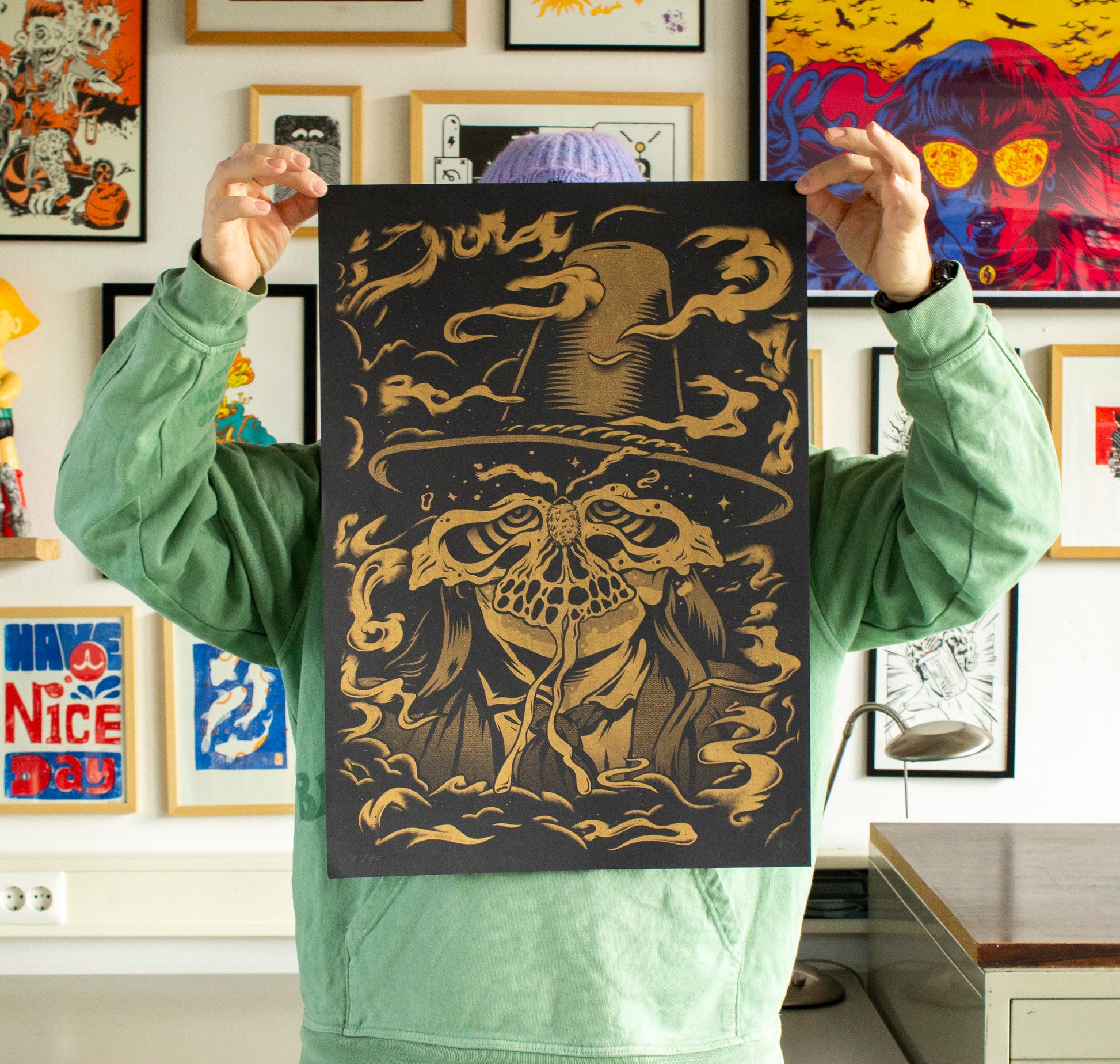 Gold RISO print on 160 grams Black Fuego stone paper.